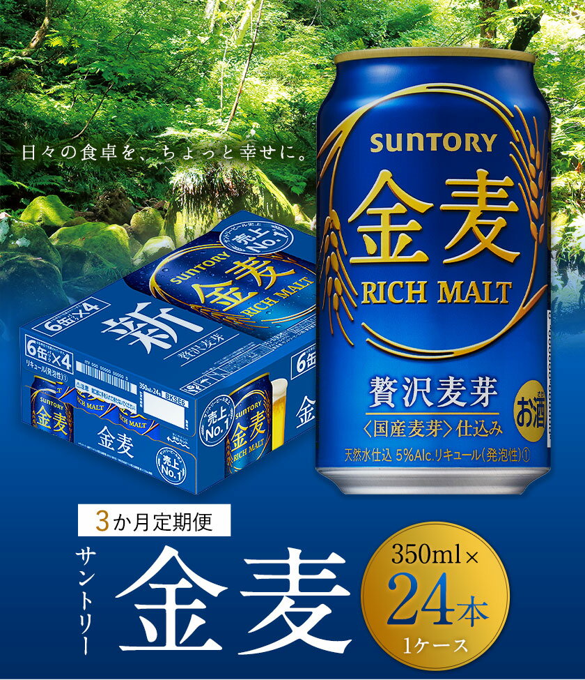 商品情報 金麦 名称 ビール 原材料 発泡酒(国内製造) (麦芽、ホップ、糖類) スピリッツ(小麦) アルコール度数 5% 成分特性 エネルギー(100mlあたり):43kcal たんぱく質(100mlあたり):0.1〜0.3g 脂質(100mlあたり):0g 炭水化物(100mlあたり):3.3g −糖質(100mlあたり):3.2g −食物繊維(100mlあたり):0〜0.1g 食塩相当量(100mlあたり):0〜0.02g プリン体(100mlあたり):約4.0mg 内容量 【1箱/月×3ヶ月(計3回)コース】 350ml×24本(1ケース)×3か月 定期便につきまして 右の内容を必ずご了承の上でお申込みください。